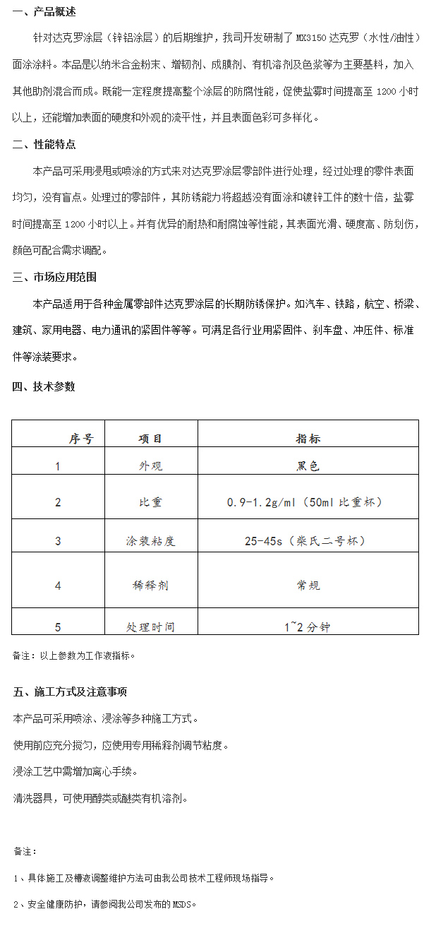產(chǎn)品名稱:MX3150達克羅面涂涂料(黑色)